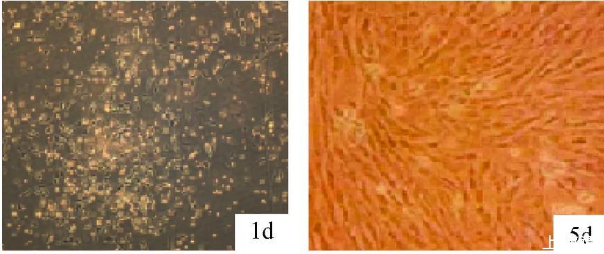 倒置相差显微镜下可见MSCs为圆形,大小不一,培养24 h后,开始贴壁,呈圆形,梭形,或多角形;5 d后,可见放射状排列的细胞群,多为梭形,胞浆丰富,胞核大,核仁清晰。见图1。
