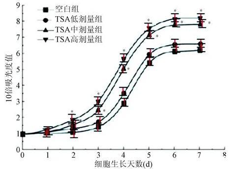 MSCs生长曲线的测定:将生长状态良好的第2代MSCs以密度为5×103个接种于96孔培养板中,置于37℃、CO2饱和湿度的5%CO2培养箱中培养,按上述TSA剂量分别加入各组中每天取1板进行MTT检测,连续1周。MTT检测时应用酶联免疫检测仪检测各孔吸光度值,选择波长为492 nm。按照检测结果,以光吸收值为纵坐标,以细胞生长天数为横坐标,绘制细胞生长曲线。