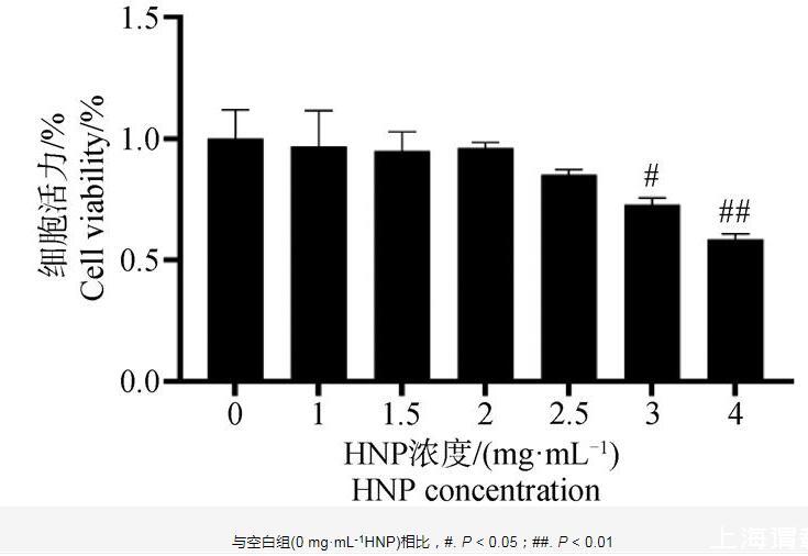 CCK-8结果如图6所示,在1.5~2.5 mg·mL-1呼宁散作用下,细胞存活率为80%~95%,且无明显差异性,呼宁散在3 mg·mL-1浓度下细胞活力显著降低(P<0.05),在4 mg·mL-1呼宁散作用下细胞成活率极显著降低(P<0.01),说明呼宁散在1~2.5 mg·mL-1浓度对细胞无明显毒性作用,因此本试验选用1.5、2、2.5 mg·mL-1作为呼宁散低、中、高剂量组的给药浓度。