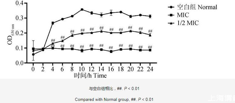 由图2可知,空白组的细菌生长繁殖较快,10 h之后细菌的生长达到较平稳状态。与空白组相比,呼宁散MIC组和1/2 MIC组作用鸡肺源大肠杆菌24 h内,细菌生长均受到明显抑制(P<0.01)。结果表明,呼宁散对鸡肺源大肠杆菌的生长具有明显的抑制作用。