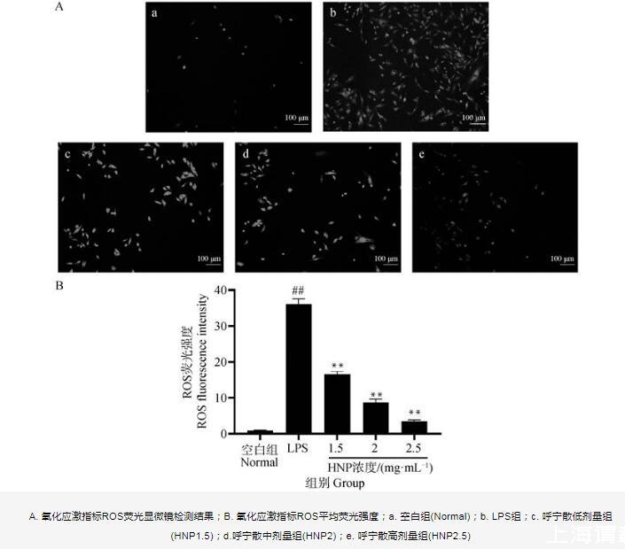 A.氧化应激指标ROS荧光显微镜检测结果;B.氧化应激指标ROS平均荧光强度;a.空白组(Normal);b.LPS组;c.呼宁散低剂量组(HNP1.5);d.呼宁散中剂量组(HNP2);e.呼宁散高剂量组(HNP2.5)