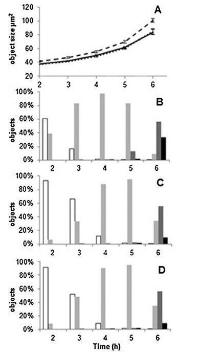 图5、在培养基中孵育2-6小时后,2-(A)、5-(B)和8-(C)日龄孢子的大小分布。条形代表静止分生孢子(21-42升,无阴影条)、肿胀的分生孢子(42-76升,浅灰色条)、发芽分生孢子(76-106升深灰色条)和菌丝生长(106-212升,黑色条)。由2日龄分生孢子(条纹线)、5日龄(虚线)和8日龄分生孢子产生的所有物体的平均大?。―)。