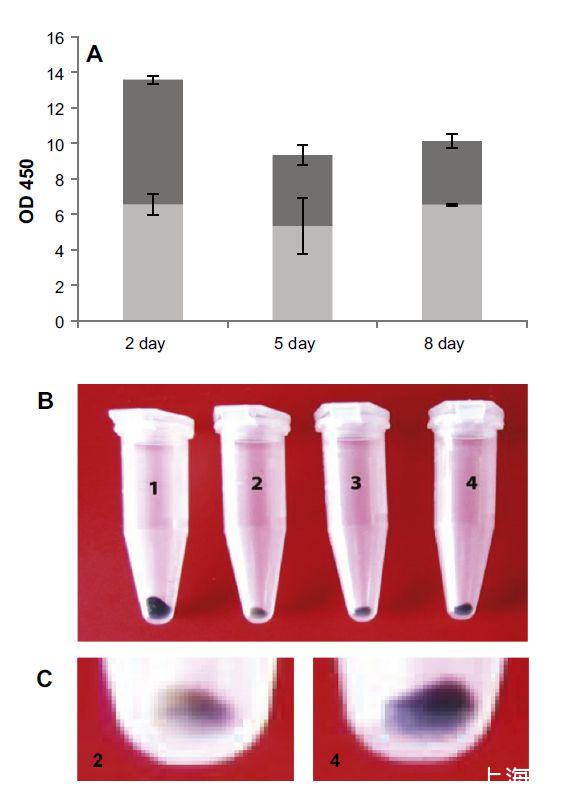 图2、用盐水吐温(深灰色阴影)和NaOH(浅灰色阴影)提取的2日龄、5日龄和8日龄的黑曲霉分生孢子的黑色素量(A)以及2-(管2)、5-(管3)和8日龄(管4)分生孢子的色素沉着用水和NaOH提取后,未提取的2日龄分生孢子作为对照(管1)(B)。(C)显示了管2和4提取的孢子颗粒的放大倍数。对比度和亮度也同样增加。误差线表示生物重复的标准差。