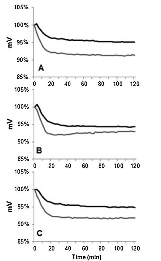 图4、在2-(A)、5(B)和8-(C)日龄生物重复分生孢子的情况下,表明代谢活性的CO2水平增加,通过CO2传感器电压(mV)的降低进行监测。