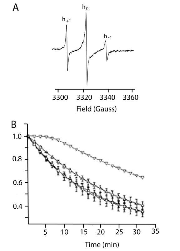 图3、PDT的减少表明黑曲霉2、5和8日龄分生孢子的代谢活性。(A)在分生孢子存在下,t=0(上层)和t=30 min(下层)时1 mM PDT的ESR谱图。高场(右)线(H)的高度用于量化PDT。(B)Hheight在2日龄(正方形)、5日(圆)和8(三角形)分生孢子中的减少。使用热灭活2日龄的分生孢子作为对照(三角形O)。误差线代表生物重复的标准差,r.u.是相对单位。