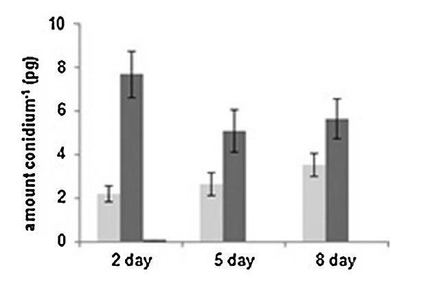 图1、黑曲霉2日龄、5日龄和8日龄分生孢子中海藻糖(浅灰色阴影)、甘露醇(深灰色阴影)和甘油(黑色阴影)的量(pg分生孢子)。误差线表示技术和生物学重复的标准差