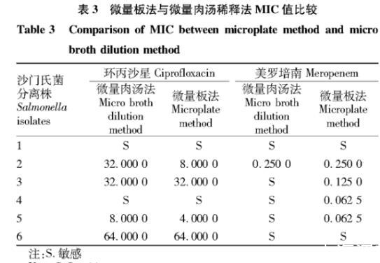 在测量菌株耐药情况的同时,选择性地扩大抗生素的浓度范围,发现用刃天青微量板法得到的MIC值和微量肉汤稀释法的MIC值会有些许差异,沙门氏菌对环丙沙星和美罗培南的耐药性如表3所示。扩大浓度范围后,用2种方法测得的4株菌的MIC有差异。其中3株菌在测量对美罗培南耐药性时发现,用刃天青微量板法检测可以得到相对应的MIC值,但用微量肉汤稀释法检测得到的却为敏感,没有确切的MIC值。这可能是因为刃天青变色敏感,更易被人肉眼和荧光检测到,而微量肉汤稀释法只关注培养基的浑浊程度,无法精确得到耐药值。这间接表明刃天青微量板法比肉汤稀释法更灵敏,对研究菌株在低浓度抗生素中的生长情况有帮助,有益于在公共衛生方面的用药安全。