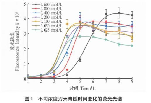 用NB肉汤将沙门氏菌进行连续梯度稀释,分装96孔培养板中,每孔加入100μL,终浓度分别为7.5×106、7.5×105、7.5×104、7.5×103、7.5×102、7.5×10 CFU/mL,菌液浓度列间递减;同时每孔加入用NB肉汤稀释的不同浓度刃天青溶液100μL,终浓度为1.600、0.800、0.400、0.200、0.100、0.050、0.025 mmol/L,刃天青浓度行间递减。设无刃天青含菌的NB肉汤为阳性对照,无菌含刃天青的NB肉汤为阴性对照,37℃恒温培养箱中培养12 h,每隔1 h观察颜色变化,检测荧光值,荧光激发波长为530 nm,发射波长为590 nm,并记录荧光数据。该试验测量荧光值和观察颜色变化来评价药物的抑菌效果,选用变为粉红色的时间为试验所需测试时间,并且将能明显显示细菌生长的刃天青浓度选为工作浓度。