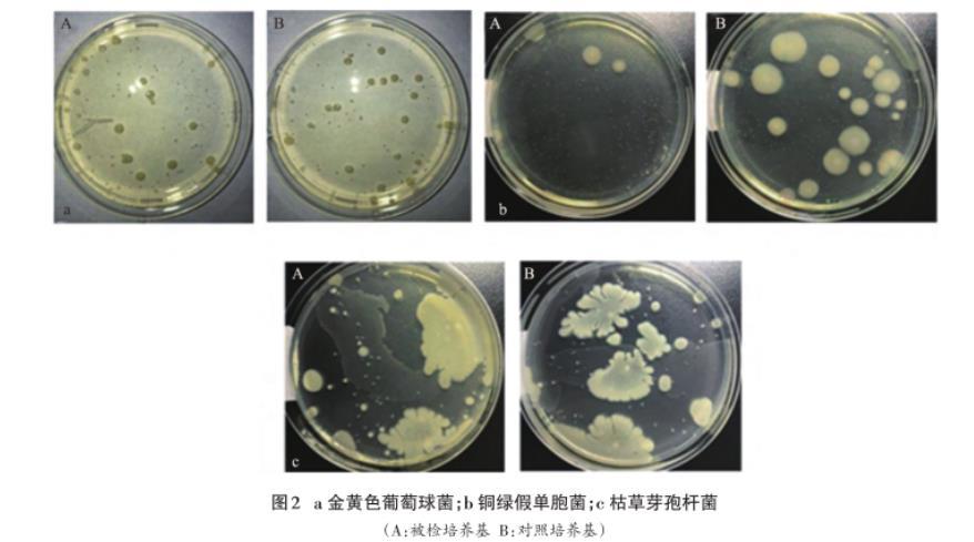 分别移取金黄色葡萄球菌、铜绿假单胞菌、枯草芽孢杆菌菌液1 mL(含菌量50-100 cfu)至灭菌平皿中,分别倾倒胰酪大豆胨琼脂培养基、胰酪大豆胨琼脂对照培养基15 mL,待其凝固后,倒置于恒温培养箱中30-35℃培养48 h。每个菌种每种类型培养基各做3个平行。测定菌落数。