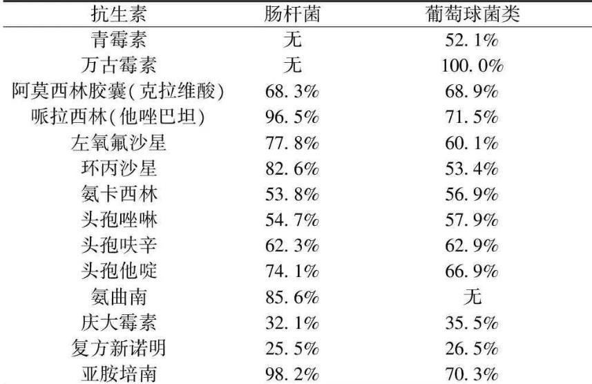 表2肠杆菌和葡萄球菌类对14种抗生素的药敏情况