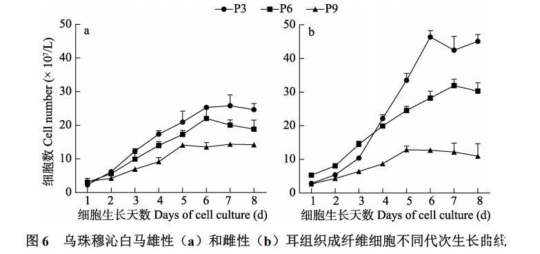 乌珠穆沁白马细胞倍增时间随着培养代次的增加而增加,而倍增次数则随培养代次的增加而减少(表1),说明随着培养代次的增加,细胞增殖速度下降,活力降低。雄性乌珠穆沁白马耳组织成纤维细胞培养过程中细胞生长曲线呈典型的“S”型(图6a),低代次细胞增殖速度较培养高代次细胞快,在培养6d或7d时细胞增殖数目达到最大值。雌性乌珠穆沁白马耳组织成纤维细胞在P3~P6时细胞生长曲线呈典型的“S”型(图6 b),生长速度最快,P9时细胞生长曲线走势平缓,生长活力没有明显的变化。