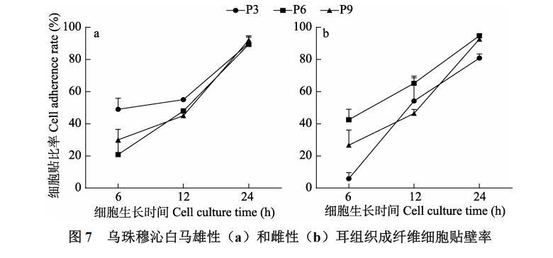 乌珠穆沁白马耳组织成纤维细胞的贴壁率随着培养时间的延长逐渐增加,6 h和12 h贴壁率均在较低的水平,24 h后贴壁率快速上升,大部分保持在90%左右(图7)。