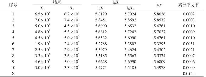 从附表中的具体数据可以看出,该10份样品中所测得菌落总数差异较大,因此,必须对检测结果所得数值取对数后,再进行检测结果对数值的标准偏差计算。按照统计学中A类评定,根据贝塞尔公式,计算最后结果: