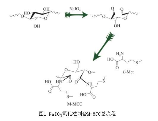 称取10 g上述所得DAC,根据DAC与所用L-Met物质的量比为1∶1称取L-Met,并将二者混合在250 mL去离子水中,在40℃、400 r/min的条件下搅拌混匀5 min后加入5 mL二甲基亚砜,并继续搅拌反应6 h。然后加入5 g硼氢化钠(NaBH4),静置至无气泡产生后,加入6 mL无水乙醇终止反应。使用去离子水洗涤所得产物2~3次后,将所得产物转移至透析袋用去离子水透析48 h,期间每8 h更换去离子水,以除去产物中掺杂的过量离子。最后冷冻干燥得到最终产物M-MCC。