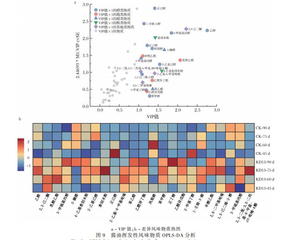以表2中60种香气成分作为因变量,不同发酵时间的2组酱油作为自变量进行OPLS-DA分析,并计算预测变量重要性投影(variable importance in projection,VIP)。VIP值越大,因变量对样品区分度的贡献值就越大,若VIP值>1表明为关键因变量。如图9-a所示,共筛选到23种VIP值>1的差异风味物质。其中酯类4种、醇类物质10种、酚类物质2种、醛类物质3种、其他类4种。对上述23种物质进行热图分析,由图9-b可以看出,KD13组多种香气物质含量比CK组多,其中包括酯类物质中的乳酸乙酯(奶油香)、辛酸乙酯(酒香)、乙酸异戊酯(花香)、乙酸异丁酯(花香);醇类物质中的乙醇(醇香)、正丁醇(葡萄酒香)、苯甲醇(花香);醛类物质中的苯乙醛(果香)、3-甲硫基丙醛(酱香);酚类物质中的4-乙基愈创木酚(烟熏香);杂环类物质中的2-乙基-6-甲基吡嗪(可可香)、2,6-二甲基吡嗪(坚果香)、2,3-二氢-3,5-二羟基-6-甲基-4H-吡喃-4-酮(焦糖香)。以上分析表明,KD13不仅对酱油中乙醇含量有提升作用,同时对乙酯类等多种酱油特征风味物质有增益作用。
