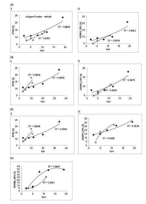 图4。聚合度(dp n)与生长促进的相关性:(A)嗜酸乳杆菌,(B)副干酪乳杆菌。副干酪乳杆菌CRL431,(C)鼠李糖乳杆菌GG和(D)副干酪乳杆菌ssp和副干酪乳杆菌DSM 20312(i)聚合度(dp n)和ET 50的相关性;(ii)果糖存在下dp n与最大OD 600值增加20%的时间相关性?;疑踩Υ砹嗬脊厶?,黑色菱形代表菊粉果类型的果聚糖。