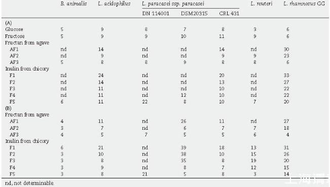 图2、(A)副干酪乳杆菌ssp和副干酪乳杆菌CRL431,(B)嗜酸乳杆菌,(C)鼠李糖乳杆菌GG,(D)罗伊氏乳杆菌,(E)副干酪乳杆菌ssp和副干酪乳杆菌DSM 20312,(F)动物双歧杆菌,和(G)副干酪乳杆菌亚种和副干酪DN114001在没有糖(对照),0.5%的存在果糖和0.5%从具有不同的聚合度菊粉中的生长曲线。从图中可以看出,在所有5种菊粉组分的存在下,嗜酸乳杆菌生长良好。而鼠李糖乳杆菌GG可以使用所有菊粉,但是菊粉来源的使用高度依赖于dp。