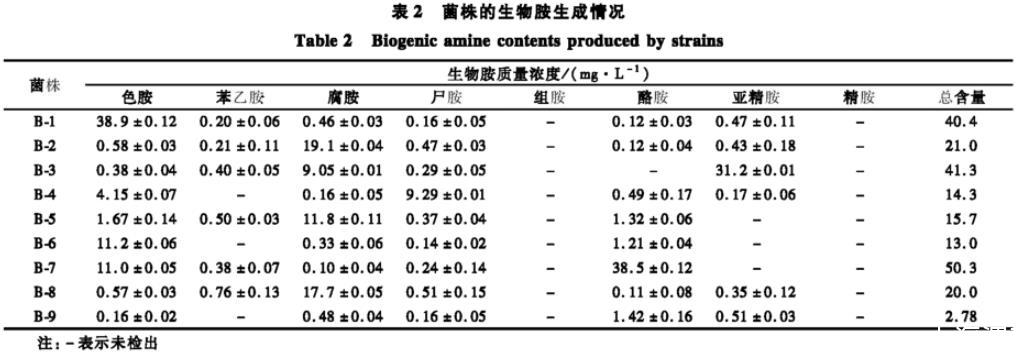为进一步确认这9株菌的产胺能力,将9株菌株分别接种到TSB培养基中,30℃培养3 d,分析培养液中生物胺产生质量浓度,结果如表2所示。由表2可知,9株菌均可产生色胺、腐胺和尸胺,菌株B-9生物胺生成能力较其他菌株最弱,总质量浓度为2.78 mg/L。B-1、B-3和B-7的产胺能力较强,总生物胺质量浓度分别为40.4、41.3和50.3 mg/L。其中B-1的色胺产生质量浓度最高,为38.9 mg/L;B-3亚精胺产生质量浓度最高,为31.2 mg/L;B-7酪胺产生质量浓度最高,为38.5 mg/L。