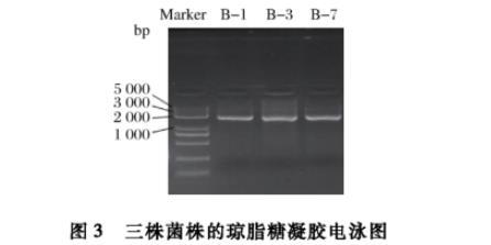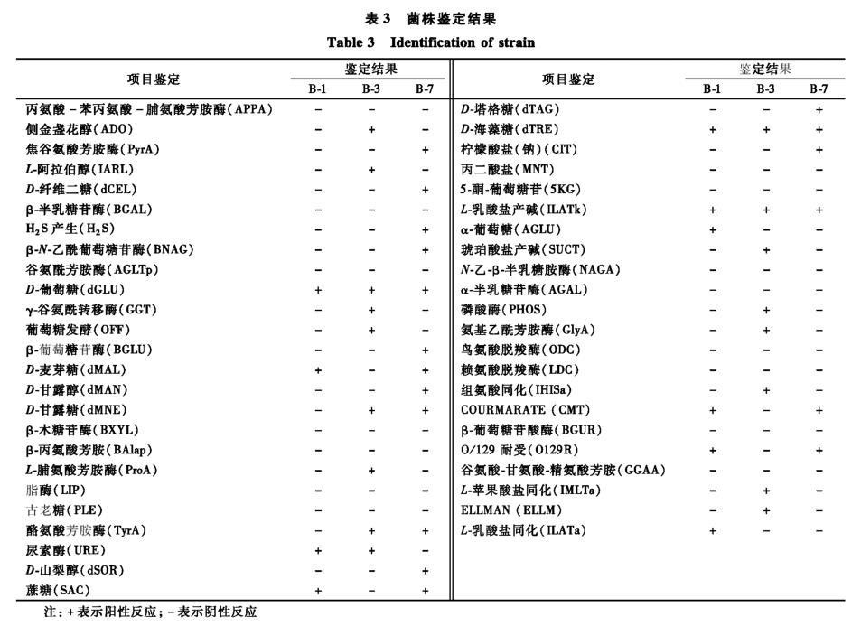 VITEK 2鉴菌仪是通过将检测菌株的各项生理生化实验反应结果与已知的菌株数据库作比较,从而推测菌株的可能性概率,可信概率范围为85.0%~99.0%。经鉴定,3株菌株的生理生化实验结果如表3所示。鉴定B-1菌株为巨型球菌(Macrococcuscaseolyticus),可信概率为99.0%;B-3菌株为产碱普罗威登斯菌(Providenciaalcalifaciens),可信概率为97.0%;B-7菌株为粪肠球菌(Enterococcusfaecalis),可信概率为99.0%。