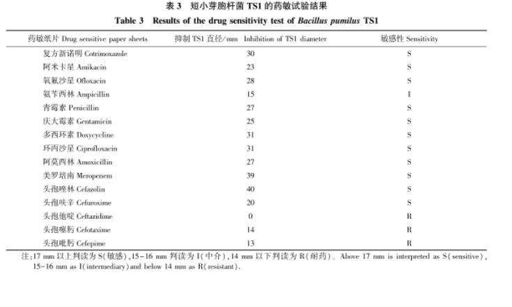 由表3可知,短小芽胞杆菌TS1对β-内酰胺类、磺胺类、四环素类、喹诺酮类、氨基糖苷类、头孢1/2/3/4代中常用的代表性药物中的复方新诺明、阿米卡星、氧氟沙星、氨苄西林、青霉素、庆大霉素、多西环素、环丙沙星、阿莫西林、美罗培南和头孢唑林极敏,对头孢他啶产生耐药,对头孢噻肟和头孢吡肟中度敏感,对头孢呋辛高度敏感。