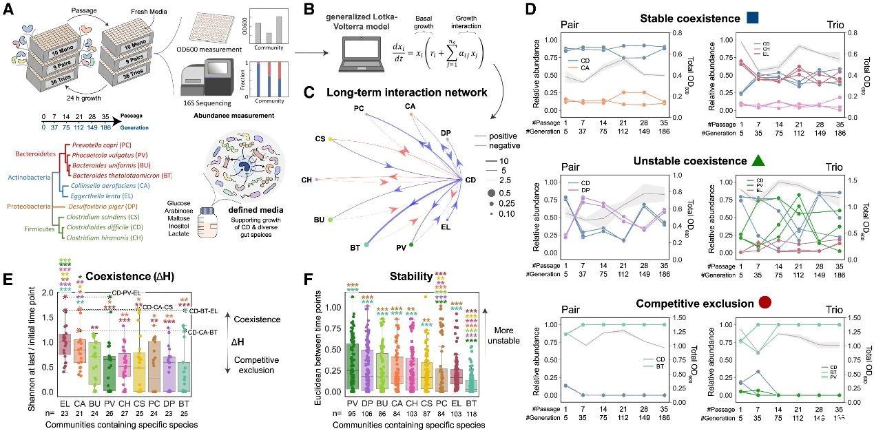 (D)艰难梭菌与肠道细菌在成对(左)和三成员(右)群落中的代表性群落动态。由彩色线条连接的数据点表示每个物种的相对丰度(左y轴),而带有95%置信区间阴影的灰色线条表示群落OD600(右y轴)。完整的群落动态见图S1C(成对)和图S2A(三成员)。稳定共存、不稳定共存和竞争排斥的分类依据图S2B。(E)使用最后一个时间点相对于初始时间点的香农多样性来测量所有包含x轴所示特定物种的成对和三成员群落中共存程度(ΔH)。