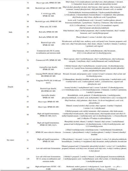 发酵豆制品最重要的特征之一是风味特征,它能够直接影响消费者的接受程度。在发酵过程中,各种微生物的协同作用产生了大量的风味物质,在发酵豆制品中已经被鉴定出碳氢化合物、醇类、醛类、酮类、酸类、酯类、杂环化合物、硫类化合物、酚类等挥发性化合物的存在,这些挥发性化合物主要由脂质氧化、蛋白质降解、美拉德反应、微生物代谢和酒精发酵等反应产生。由于制作曲所用的微生物不同,不同类型的发酵微生物的风味类型和风味量也不同,不同发酵豆制品中的常见的挥发性化合物见表2。
