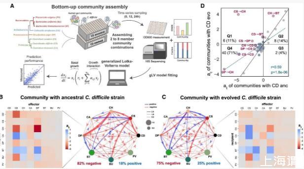 (B和C)7种肠道微生物与祖先(B)和进化(C)艰难梭菌株之间的推断种间交互网络。节点大小代表各物种的载体容量,边的宽度表示种间交互系数(aij)的大小。热图显示了社区中8种物种之间的aij。