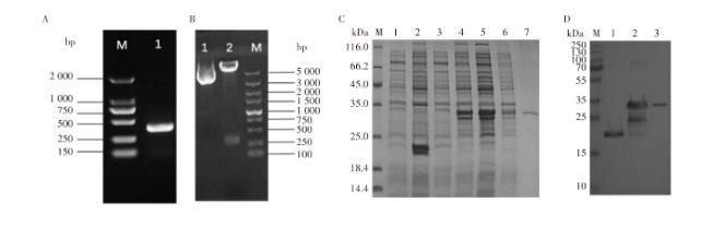 图1 Microplusin-like基因扩增、双酶切和重组蛋白的表达结果注:A.Microplusin-like基因扩增,M.DL2000 marker,1.Microplusin-like PCR产物;B.双酶切结果,M.DL5000 marker,1.pCold-SUMO;2.pCold-SUMO/Microplusin-like;C.SDS-PAGE结果,M.14.4~116 kDa protein marker,1.pCold-SUMO空载未诱导,2.pCold-SUMO空载诱导,3.重组载体未诱导,4.重组载体诱导,5.重组载体表达沉淀,6.重组载体表达上清,7.纯化后的重组蛋白;D.Western Blot结果,M.10~250 kDa蛋白marker,1.空载体诱导,2.重组载体诱导,3.纯化后的重组蛋白。