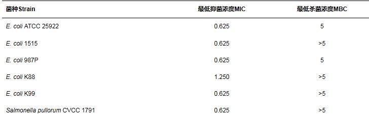 对各供试菌株的MIC及MBC结果表明,重组蛋白对大肠埃希菌及沙门菌具有较高的抑菌活性,除E.coli K88外,最小抑菌浓度均在0.625 mg/mL,但其杀菌活性相对较弱,部分菌株的MBC值超过5 mg/mL,达到了MIC的8倍(表2)。