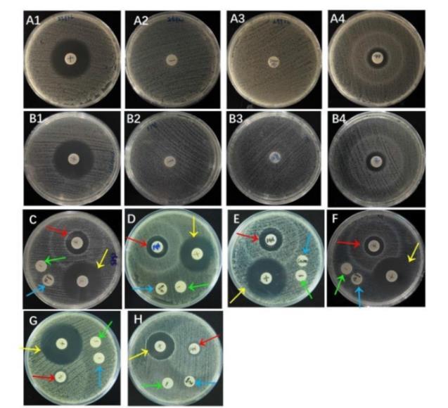图2 Microplusin-like的抑菌圈试验结果注:A1~A4依次为:E.coli ATCC 25922阳性对照、阴性对照、空白对照、Microplusin-like;B1~B4依次为Salmonella pullorum CVCC 1791阳性对照、阴性对照、空白对照、Microplusin-like;C.E.coli 1515;D.E.coli 987P;E.E.coli K88;F.E.coli K99;G.S.aureus CVCC 1882;H.S.aureus ATCC4 3300;C~H.红色箭头为Microplusin-like,绿色箭头为阴性对照,蓝色箭头为空白对照,黄色箭头为阳性对照。