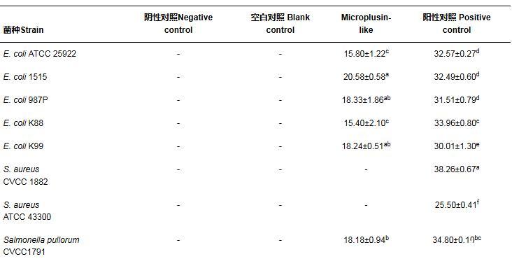 表2 Microplusin-like的最低抑菌浓度和最低杀菌浓度mg/mL