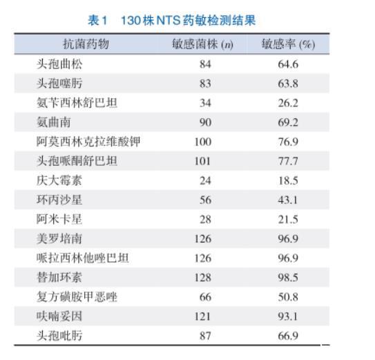 130株NTS对氨基糖苷类抗菌药物(庆大霉素和阿米卡星)的敏感率仅20%左右,对环丙沙星的敏感率为43.1%,对复方磺胺甲恶唑的敏感率为50.8%,对头孢曲松和头孢噻肟的敏感率分别为64.6%和63.8%,对氨曲南和头孢吡肟的敏感率分别为69.2%和66.9%。对阿莫西林克拉维酸钾的敏感率与对头孢哌酮舒巴坦的敏感率接近(76.9%vs 77.7%)。对呋喃妥因(硝基呋喃类)的敏感率为93.1%,对哌拉西林他唑巴坦与美罗培南的敏感率相同,均为96.9%。对替加环素的敏感率为98.5%。见表1。