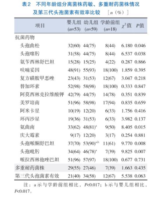 130例患儿按年龄分为婴儿组(<12月龄)、幼儿组(12~<36月龄)和学龄前组(36~72月龄),比较各年龄组分离菌株对不同抗菌药物的敏感率。结果显示,幼儿组分离菌株对氨曲南、头孢吡肟的敏感率高于学龄前组,对头孢哌酮舒巴坦的敏感率高于婴儿组和学龄前组(P<0.017)。见表2。