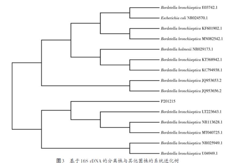 接种病死家兔肺脏组织的 TSB 平板在 37 ℃培养 24 h 后长出白色、细小、透明的单个菌落。革兰氏染色镜检可见阴性短杆菌。用引物扩增分离株 16S rDNA 基因,扩增产物在 1 500 bp 左右有 1 条特异性条带,产物测序后经 BLAST 比对,发现分离株的 16S rDNA 基因序列与 GenBank 中支气管败血波氏杆菌的同源性达 99%。将所得菌株命名为 P201215。筛选来源不同且具有代表性的 14 株其他菌株的 16S rDNA 基因序列,构建与分离株 16S rDNA 的系统进化树。