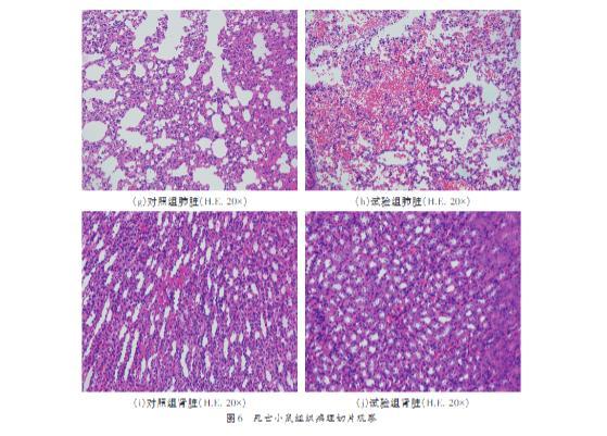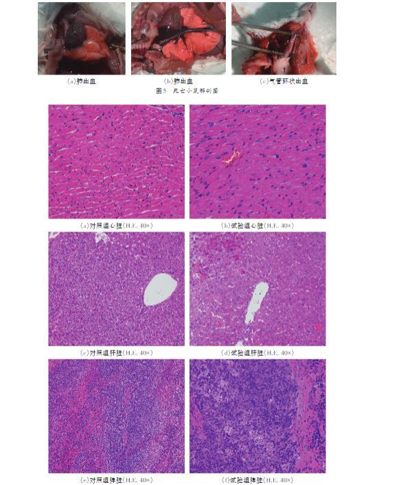 病理组织切片观察结果显示,试验组小鼠心脏无明显异常大量肝细胞变形,胞质疏松淡染;脾脏多见凋亡小体;肺脏严重出血,肺泡腔内可见大量红细胞;肾脏无明显异常。对照组小鼠心脏、肝脏、脾脏、肺脏及肾脏病理切片均无明显病变。