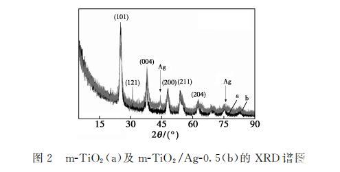 图2为m-TiO2和m-TiO2/Ag-0.5的XRD谱图。由图可见,m-TiO2在2θ=4~90°扫描范围内有5个明显的衍射峰,分别位于25.3°、37.9°、48.0°、53.9°和62.6°处,与锐钛矿相m-TiO2对应的(101)、(004)、(200)、(211)和(204)衍射面(PDF:21-1272)能够很好地吻合,而在2θ=30.1°的衍射峰则对应的是板钛矿(121)晶面,由峰的相对强度可知,这是以锐钛矿为主含有少量板钛矿的混晶。