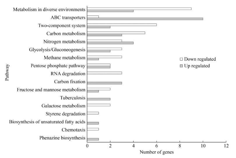图5在高光强900μmol/(m2·s)下高光6803与野生型6803在不同代谢途径中的差异表达基因分布