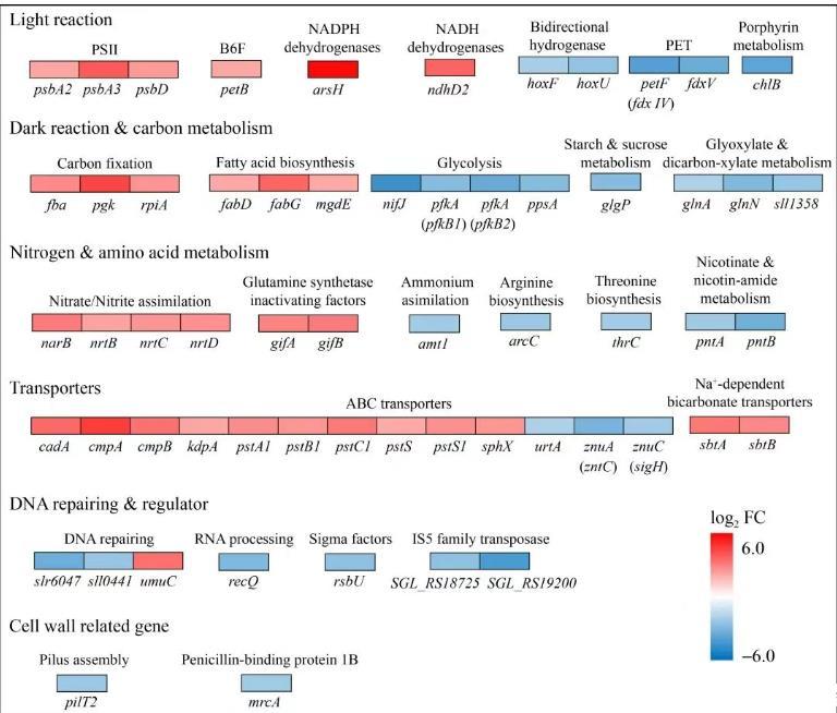 与以上光反应相关基因的差异化表达趋势类似,在高光条件下,相比野生型6803,高光6803中与光合固碳、能量-物质代谢、跨膜转运相关基因的表达水平也有显著变化。如cmpA、cmpB编码ATP依赖的碳酸氢盐转运蛋白复合物组分,cmpA与cmpB的表达分别上调了24.3倍与10.5倍。此外,编码卡尔文循环中核糖5-磷酸异构酶的rpiA表达上调了6.0倍,编码磷酸甘油酸激酶的pgk、编码果糖-1,6-二磷酸醛缩酶的fba表达分别上调21.5倍与7.0倍。因此,我们推测高光6803耐高光、生长快、生物量积累多也得益于碳酸氢盐转运蛋白复合物、固碳反应相关基因的表达上调。