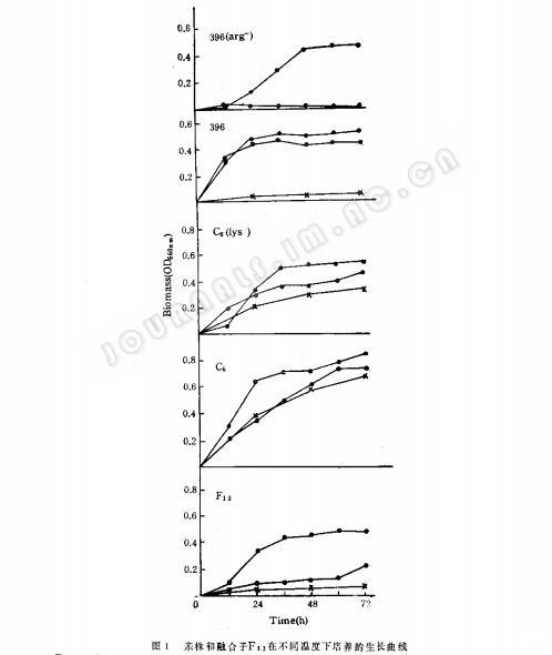 1.在不同温度条件下亲株和融合子的生长曲线:出发亲株、直接亲株和融合子在YPD液体培养中静止培养在28℃、42℃和45℃,72h的生长曲线(图1)表明营养缺陷型菌株的耐热性比出发菌株显著下降,而回到原养型的融合子耐热性虽然各株不一,但也都比原出发亲株略差。