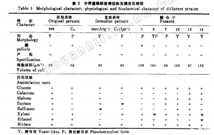 随机挑出6株融合子进行考核。从其从表2和表3可以看出融合子的培养特征形态,大小、每个细胞的DNA含量和生理生化特征表现不一,特别是糖类同化更是多样,其细胞体积平均为亲株的1.3倍,DNA含量平均为亲株的1.6倍。