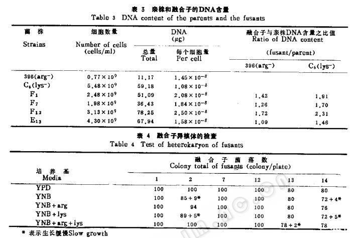 营养需求看除了F,在YNB上有时生长,有时不生长,而在补充了精氨酸的YNB平皿上完全不生长外,其他均为原养型菌株,融合子与原始亲株和直接亲株的生物学特性比较见表2。DNA含量的比较见表3。