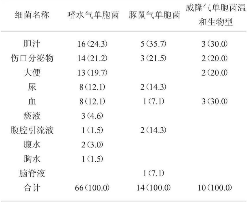 2.5标本来源嗜水气单胞菌感染病例的标本来源以胆汁为主,其次是伤口分泌物和粪便;豚鼠气单胞菌的标本主要来源于胆汁和伤口分泌物;威隆气单胞菌温和生物型主要源于胆汁和血液;杀鲑气单胞菌6例来源于粪便1例、伤口分泌物1例、尿2例和痰液2例;威隆气单胞菌威隆生物型的标本来自胆汁,见表2。