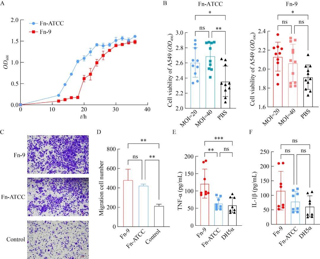 图1具核梭杆菌促进A549细胞的增殖和转移。A:2株菌株的生长曲线;B:MTT实验检测细胞增殖;C、D:Transwell实验检测细胞转移;E、F:2种菌株与大肠杆菌DH5α的促炎能力比较。
