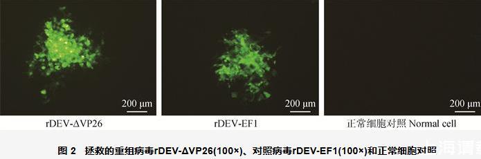 参照磷酸钙转染方法将pDEV-ΔVP26转染至CEFs,待其出现荧光且荧光斑达到90%后收获病毒,命名为rDEV-ΔVP26。