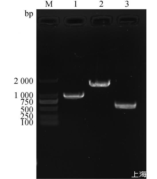 M.2000 bp相对分子质量标准(2 000、1 000、750、500、250、100);1.pDEV-EF1(949 bp);2.pDEV-ΔVP26-Kan(1 634 bp);3.pDEV-ΔVP26(595 bp)