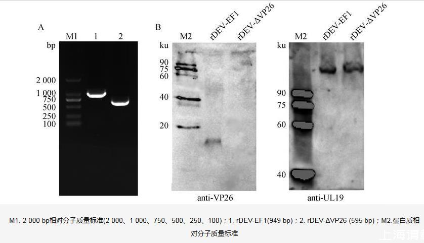 图3 PCR方法(A)和Western blot法(B)验证rDEV-ΔVP26病毒UL35缺失