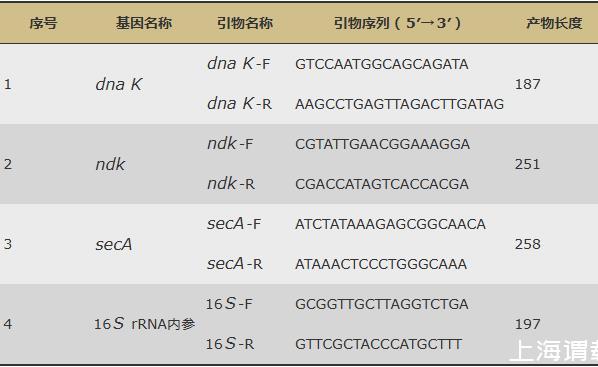 为验证转录组数据的准确性,实验通过荧光定量PCR(Real-time polymerase chain reaction,RT-qPCR)验证差异基因的表达水平。首先将2.4中获得的RNA反转录成cDNA,再根据转录组测序分析的结果,以16S rRNA为内参基因,选择dna K、ndk、secA基因进行验证,通过Primer 5.0软件设计引物,具体序列见表1。最后计算相对表达量差异2-ΔΔCT。