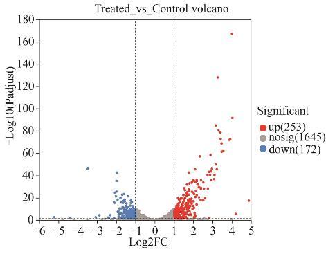 对样本采用DESeq 2分析,筛选条件设为Padj<0.05且|Log 2(fold change)|≥1.5以获得差异显著表达基因。结果显示共有425个差异表达基因,其中253个基因表达被滇黄精水提物干预上调,172个基因表达被滇黄精水提物干预下调。说明经过滇黄精水提物处理的L.reuteri 1.2838许多基因在mRNA水平有差异表达(图3)。
