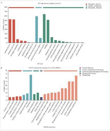 GO是基因本体论的简称,是基因功能国际标准分类体系[10]。GO分为分子功能(Molecular function)、生物过程(Biological process)和细胞组成(Cellular component)三个部分[11]。通过GO数据库对富集程度最大的前20条差异转录基因进行分类。差异转录本的GO分类如图4A所示。差异基因主要富集在分子功能(Molecular function)中,然后为生物过程(Biological process)和细胞组成(Cellular component)。其中,细胞质(Cytoplasm)、膜组成部分(Integral component of membrane)、三磷酸腺苷结合(ATP binding)和翻译过程(Translation)等组别中差异基因富集较多。
