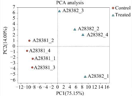 主成分分析(PCA)显示,正常组和滇黄精水提物组呈现显著分离,表示组间差异明显。在PCA图中,样本点之间的聚集程度反映了样本之间的相似性。如图2所示,给药组样本点之间距离较近,说明样本之间的差异性较小,表明样品制备合理可用于后续分析。